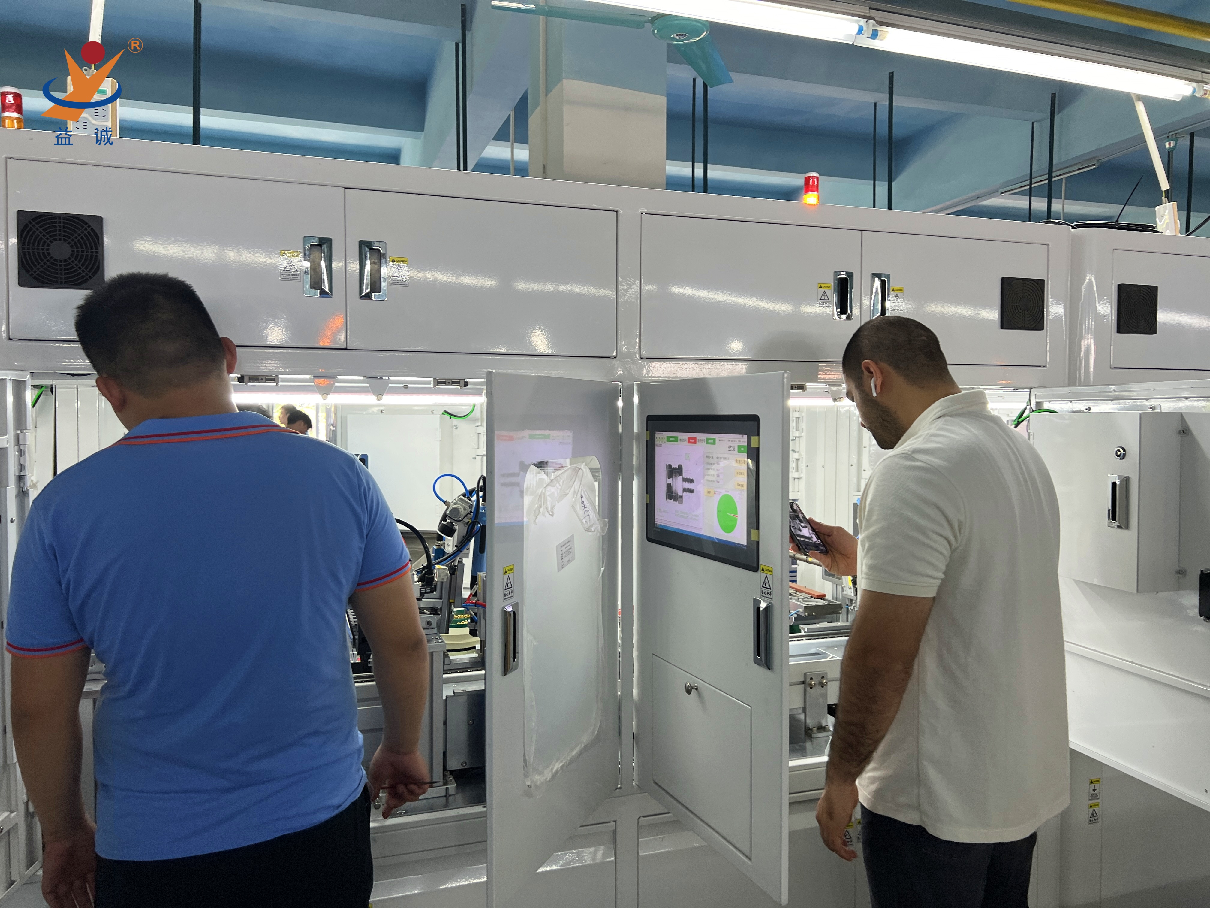 來自法國的客戶團隊正在現(xiàn)場對高端智能低壓電器自動化生產(chǎn)線進行細致地驗收,該種類設備是益誠自動化的實力產(chǎn)品之一,是集合高智能、高精度、高產(chǎn)能與實時數(shù)據(jù)化檢測系統(tǒng)等高端技術于一體的高科技自動化生產(chǎn)線。