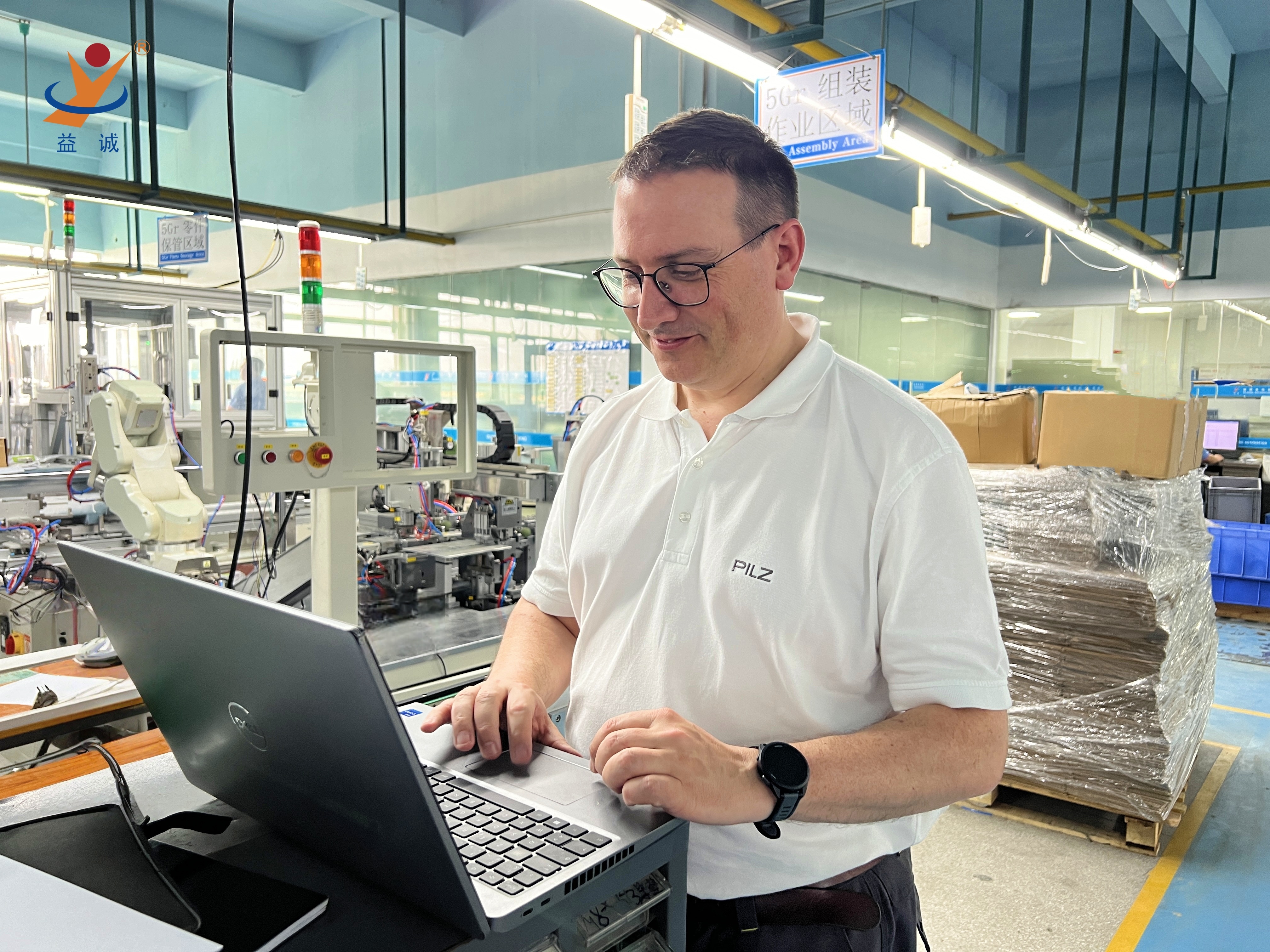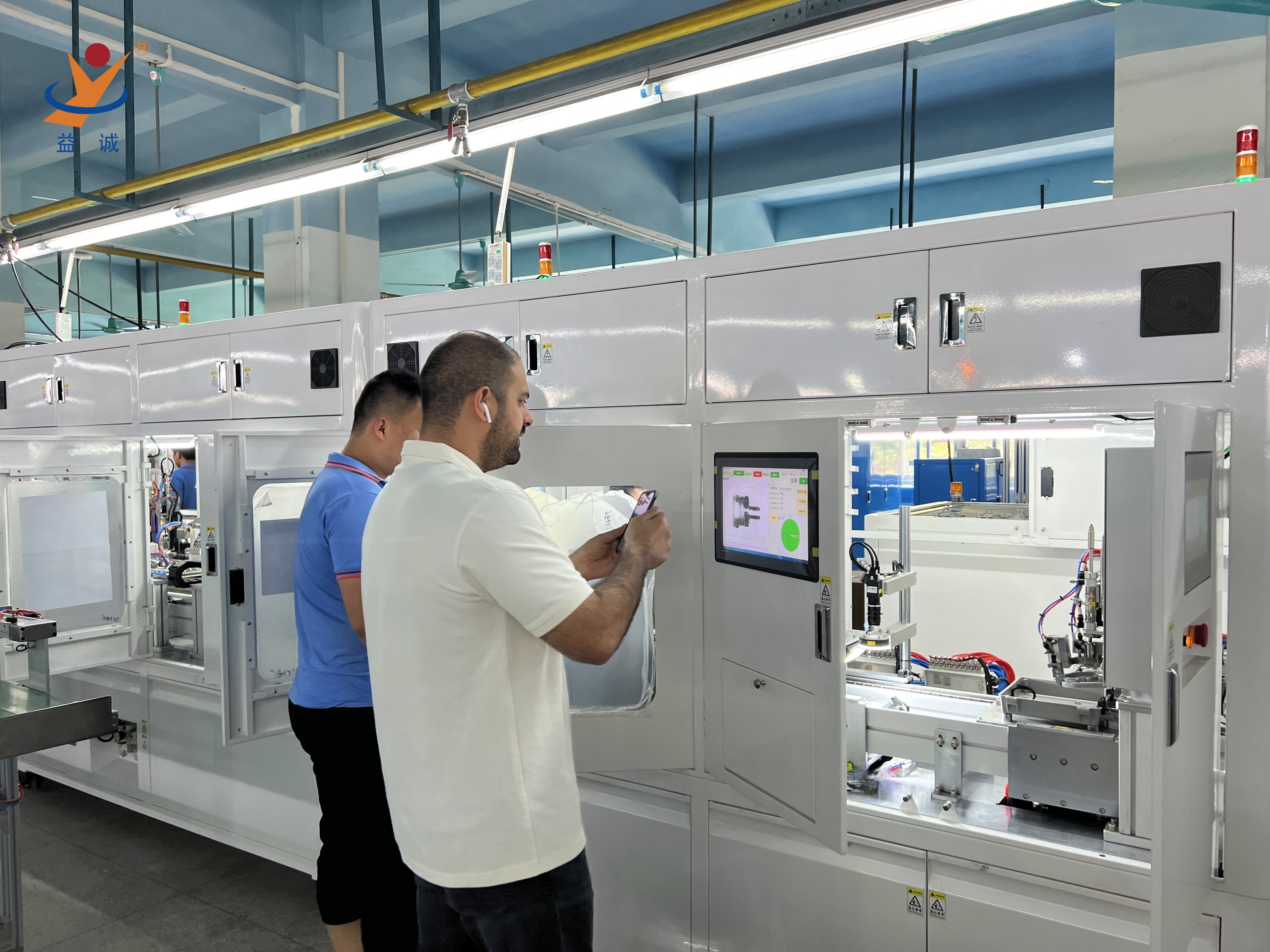 來自美國的客戶團隊是益誠的資深優(yōu)質合作伙伴,目前正在對一條高端智能網(wǎng)絡設備自動化生產(chǎn)線進行驗收,該條高智能、高科技的全自動化生產(chǎn)線由益誠結合客戶深度需求研制。